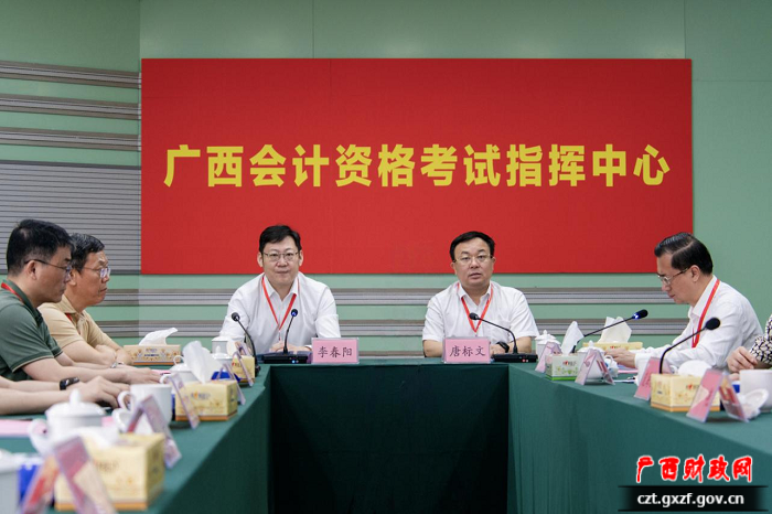 开考首日上午,自治区财政厅党组书记、厅长李春阳,自治区人力资源社会保障厅党组书记、厅长唐标文,自治区财政厅党组成员、副厅长陈海涛,带队到区直考点广西开放大学现场巡考,实地巡视检查会计专业技术资格考试考场秩序、设备保障、考风考纪、视频监控运行、防范打击考试作弊措施落实、考生服务保障等情况。巡考组以视频连线方式,听取柳州市、桂林市、贺州市等三个考区考务组织管理情况汇报。李春阳厅长指出,会计资格考试是选拔和评价会计人才的重要途径,事关国家选才育才,事关万千考生的切身利益,事关社会公平正义底线,容不得丝毫马虎和松懈。他强调,各考区要深刻认识组织实施会计资格考试工作的重要意义,以时时放心不下的责任感,高标准高质量组织实施好会计资格考试工作,为党和国家把好会计人才队伍的入口关,更好服务全国全区发展大局。李春阳厅长要求,各考区要强化责任担当,从严从细抓好各项安全措施落实,以系统思维、底线思维统筹好“人防”“物防”“技防”,确保考试安全平稳有序进行。同时,要将考生至上的理念贯穿考试工作组织实施全过程,持续优化服务保障,确保2025年度全国会计专业技术初、高级资格考试广西考区工作圆满完成。